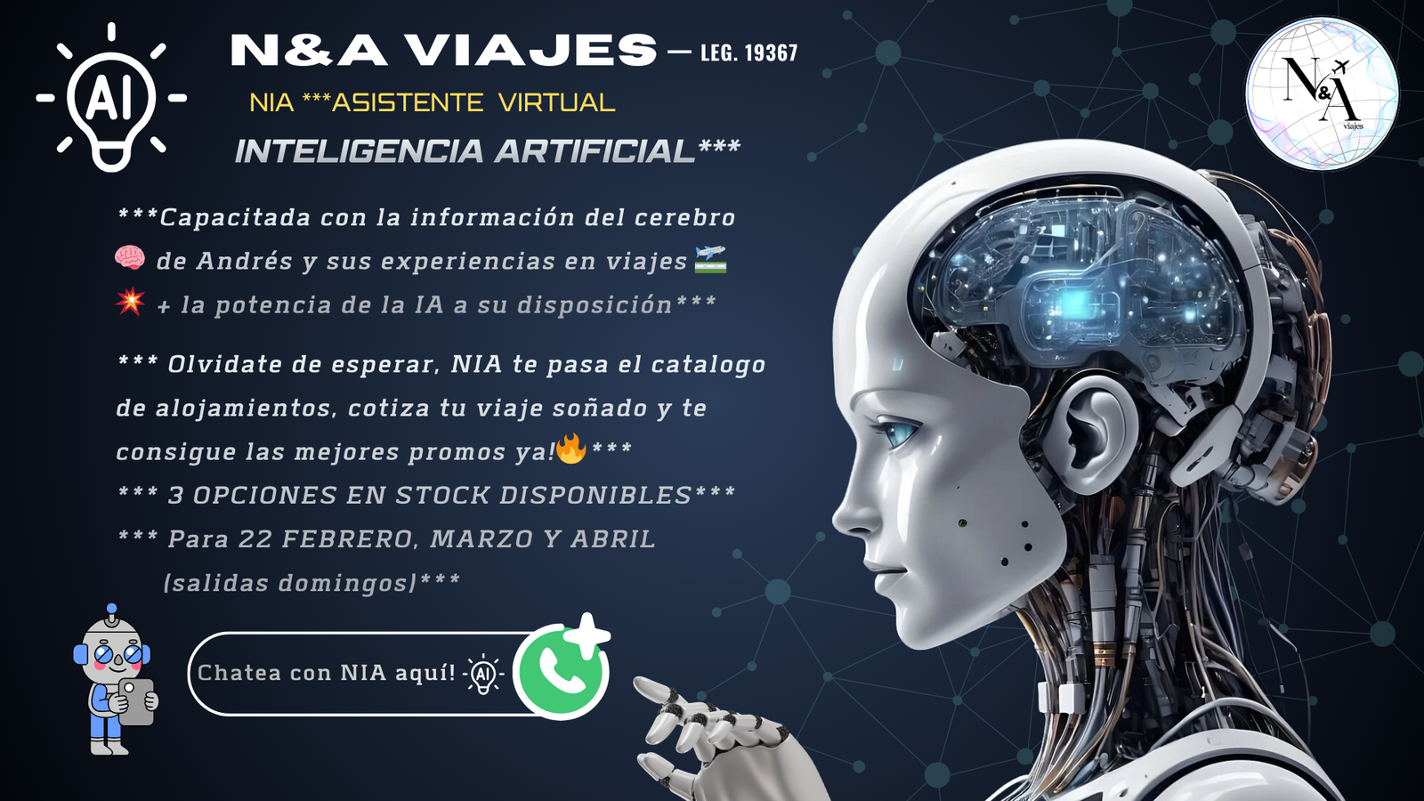 Hace CLICK! en la imagen y comunícate con NIA IA nuestra asistente virtual para despejarte todas las dudas referidas a tu viaje ideal!